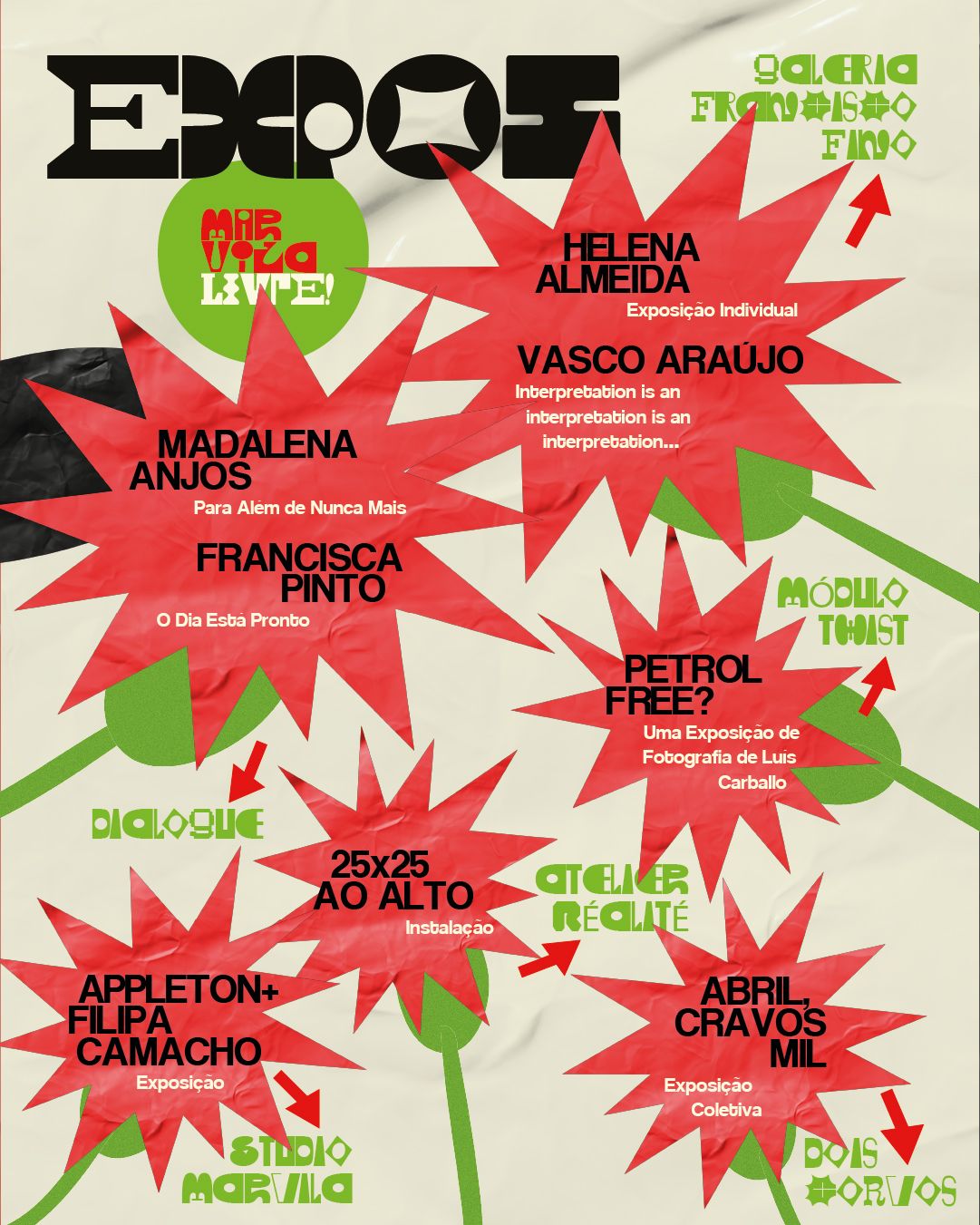 O percurso inclui várias mostras e projetos artísticos, entre os quais: Helena Almeida — exposição individual; e Vasco Araújo — “Interpretation is an interpretation is an interpretation…” na Galeria Francisco Fino. Madalena Anjos — “Para Além de Nunca Mais”; e Francisca Pinto — “O Dia Está Pronto” podem ser vistas na Dialogue. Appleton + Filipa Camacho apresentam-se no Studio Marvila. A exposição coletiva “Abril, Cravos Mil” estará na Dois Corvos. A instalação “25x25 ao Alto” no Atelier Realité. E, por fim, “Petrol Free?” — exposição de fotografia de Luís Carvalho poderá ser vista na Módulo Twist. A proposta passa por circular entre os diferentes espaços e descobrir projetos que cruzam artes visuais, fotografia, instalação e experimentação.