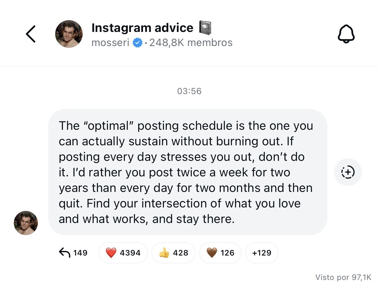 O relógio marcava as 03:56 desta quinta-feira, hora de Lisboa, quando surgiu uma mensagem de Adam Mosseri, diretor do Instagram, no seu canal de distribuição. Dizia: “O calendário de publicações "ideal" é aquele que consegues realmente manter sem te esgotar. Se publicar todos os dias te provoca stress, não o faças. Prefiro que publiques duas vezes por semana, durante dois anos; do que todos os dias, durante dois meses; e depois, desistas. Encontra a interseção entre aquilo que amas e aquilo que funciona, e permanece aí”.