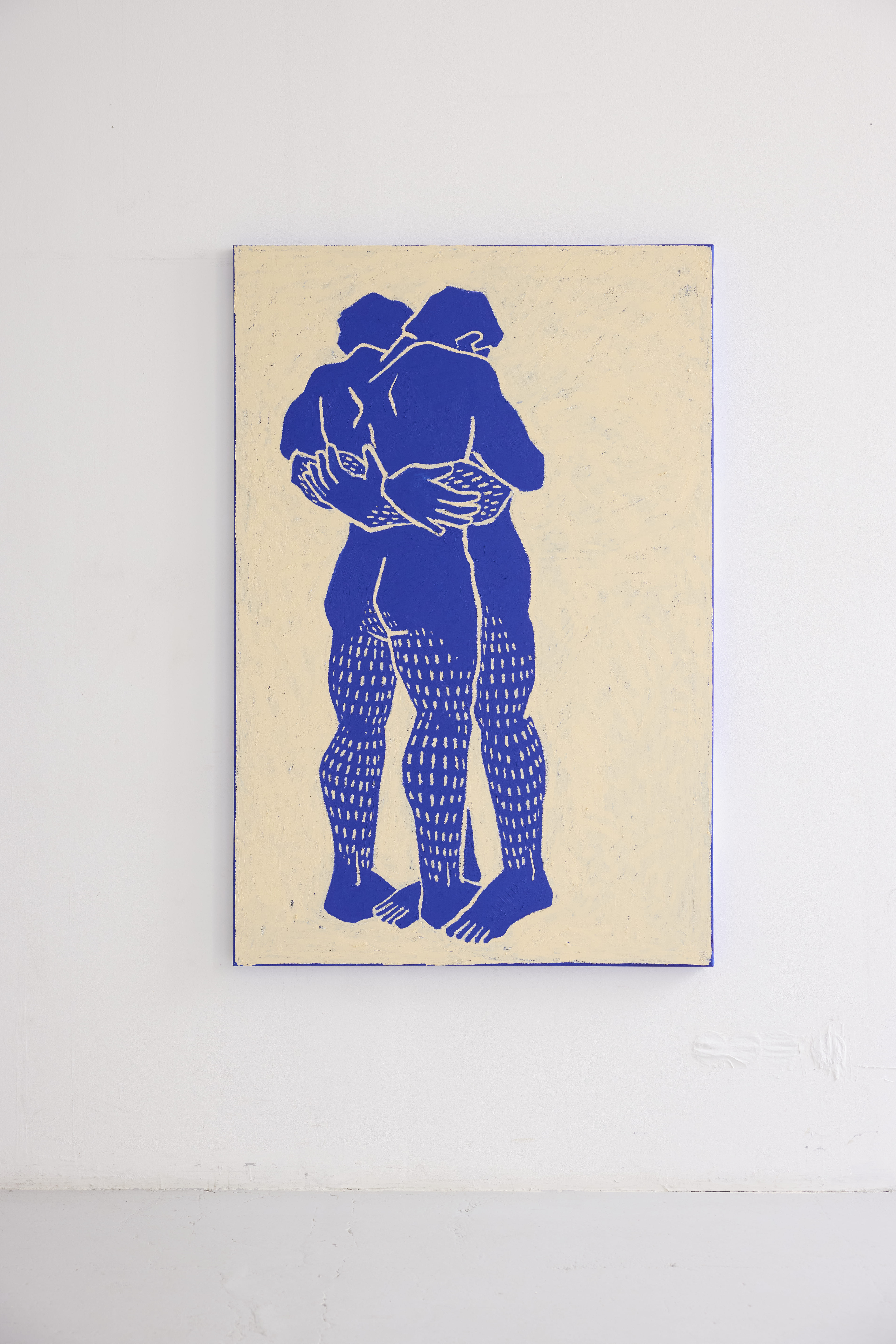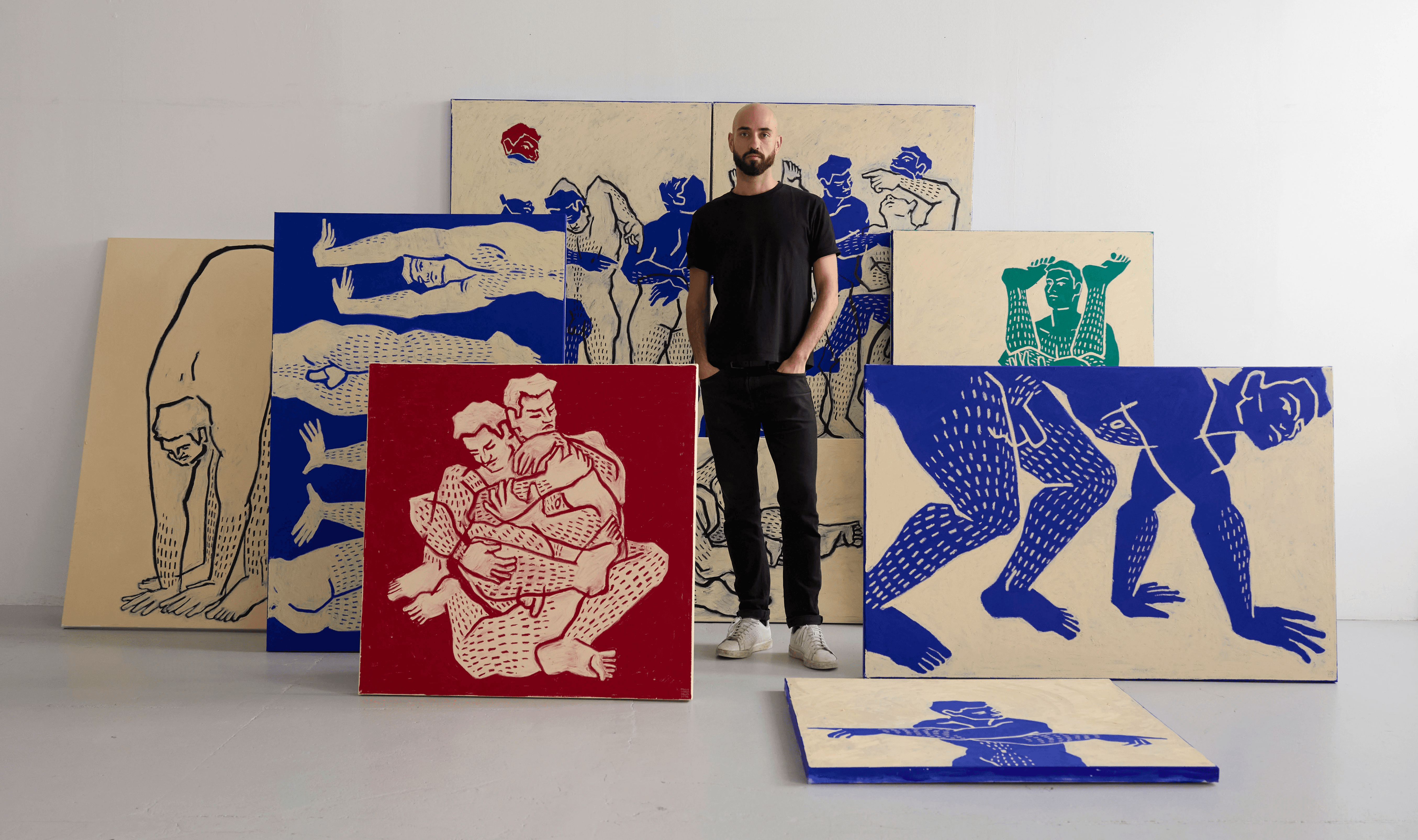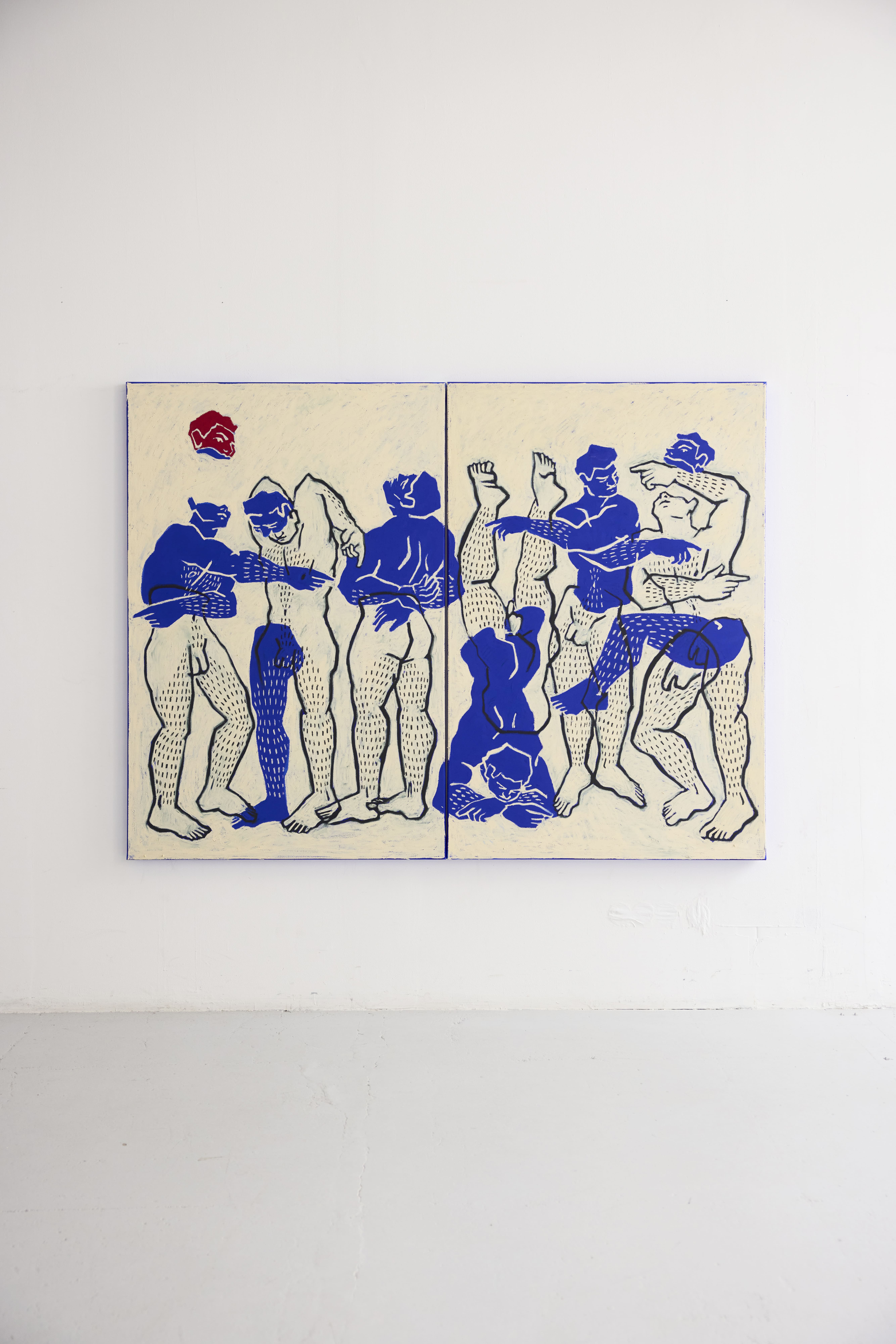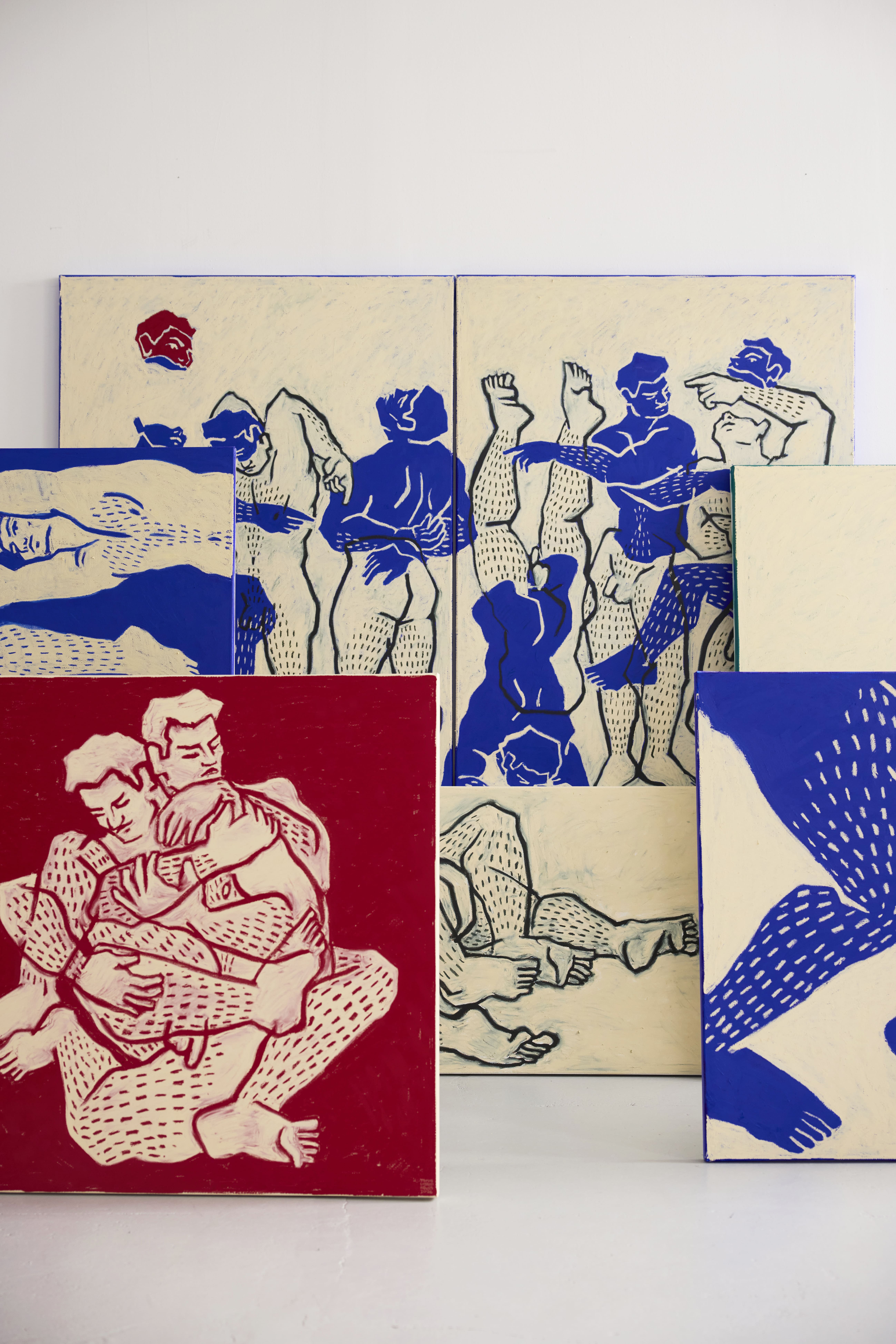 T.C.N. — Destaco duas peças. A primeira é How to Exist, a maior pintura da exposição. É, provavelmente, a questão mais abrangente, porque engloba todas as dúvidas, inseguranças e decisões. É uma peça que reflete muito sobre a incerteza e sobre a necessidade de fazer escolhas, com várias figuras a tomar decisões (fotografia abaixo). A segunda peça é How to Stand on Your Own, uma desenho escultórico de grande escala. Existe aqui uma dicotomia entre a estrutura necessária para um corpo se sustentar e, na prática, a peça é um grande corpo feito de tela estendido no chão, ao mesmo tempo que se tenta abraçar. A peça nasce da tensão entre a ideia de autonomia e a fragilidade dessa possibilidade.